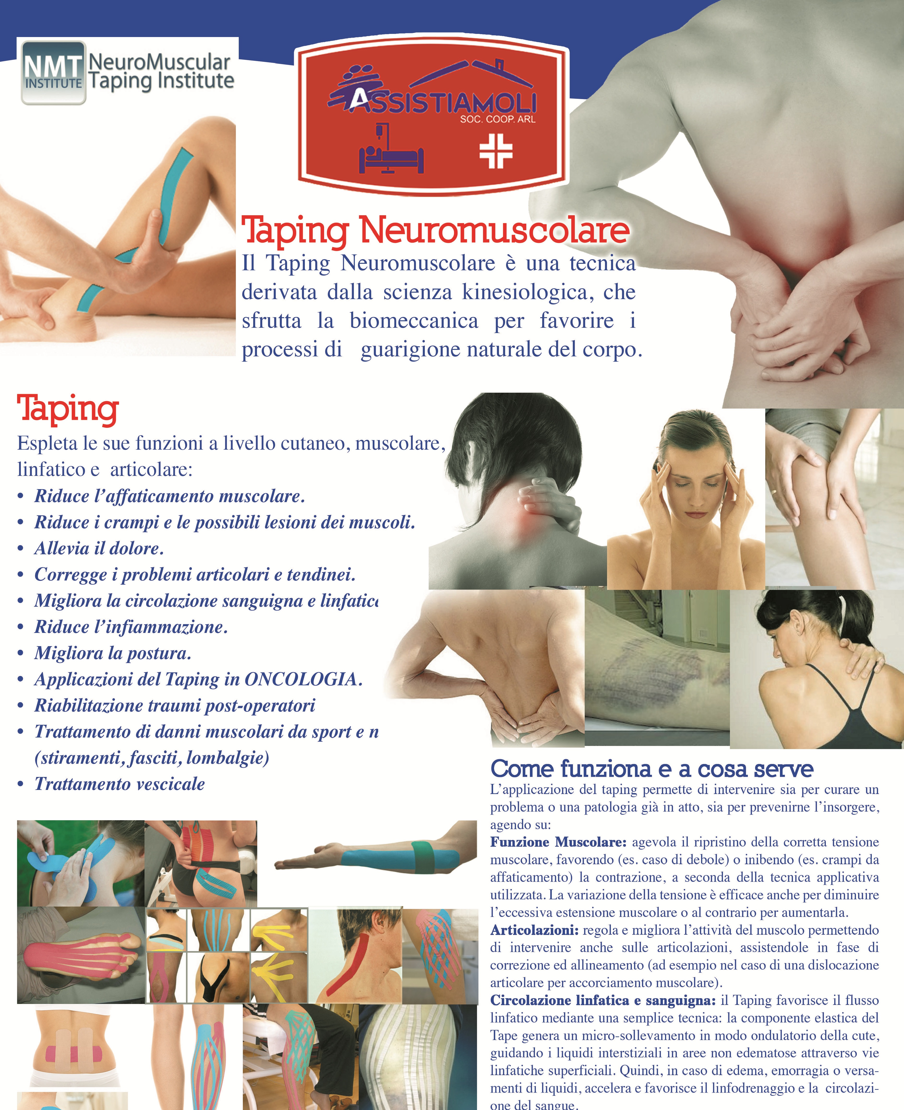 Il Taping Neuromuscolare è una tecnica derivata dalla scienza kinesiologica, che sfrutta la biomeccanica per favorire i processi di guarigione naturale del corpo. vvalendosi semplicemente del “movimento” (dal greco kinesis) della muscolatura, con il tape neuromuscolare applicato, si riesce a riattivare i sistemi ed i processi neurologici e circolatori.